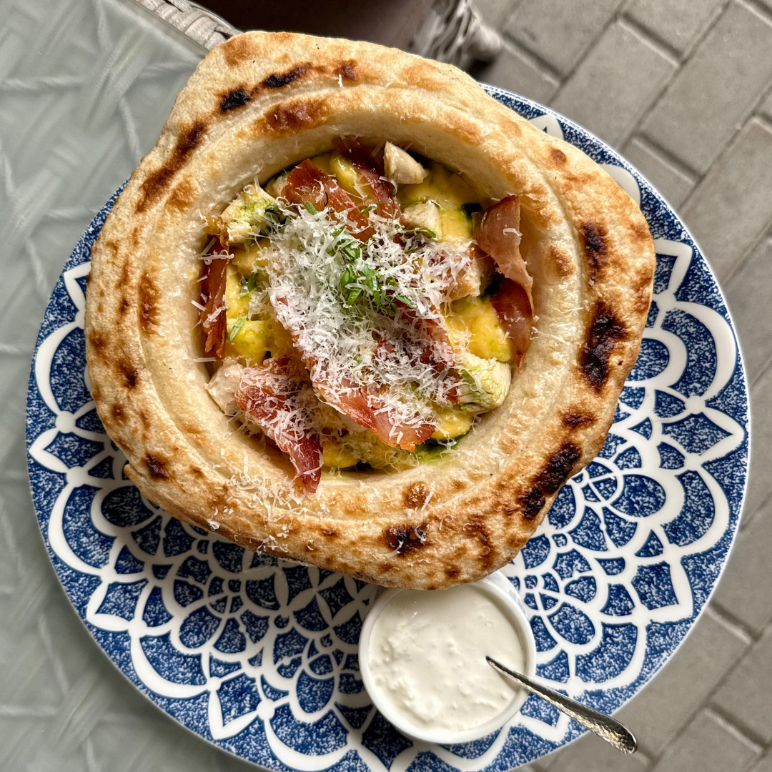 куряче філе су-від, моцарела, гарбузовий соус, прошуто, пармезан, страчатела